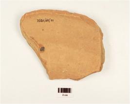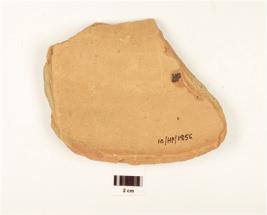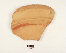 | Description / विवरण | Fragment of a black on red ware handi , projected ridge on exterior with a faded horizontal band, painted with black pigment, traces of red slip, medium fabric and well baked. |