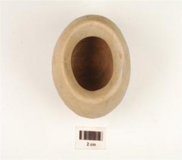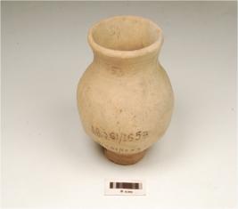 | Description / विवरण | A miniature vase of dull red ware with out-curved rim, concave neck, globular body and foot base. |