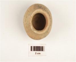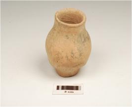 | Description / विवरण | A dull red ware miniature vase with vertical rim, globular body, foot base and surface in red slip. |
