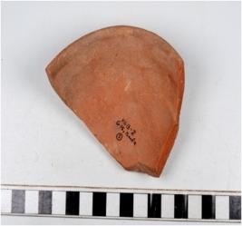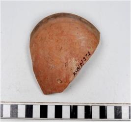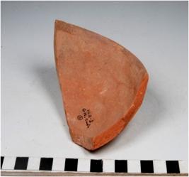 | Description / विवरण | A fragment of a bowl of red ware with round headed rim, painted with black showing circular bands on exterior, oblique sides of medium fabric. |
