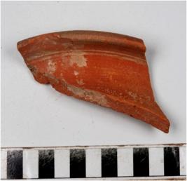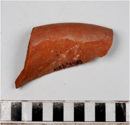 | Description / विवरण | A fragment of a vase of red ware with out turned rim, having a black horizontal rim band, concave neck, oblique sides, of medium fabric. |