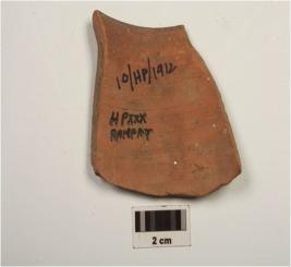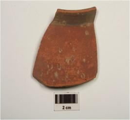| Description / विवरण | A fragment of a red ware vase, treated with red slip, has a vertical rim with a horizontal band on it, medium fabric & well baked. |