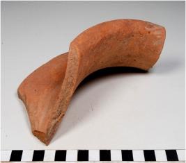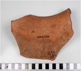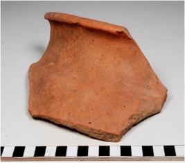 | Description / विवरण | A fragment of a jar of red ware with externally thickened out curved rim, concave neck, spreading profile, oblique sides of medium fabric, sturdy texture. |