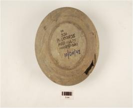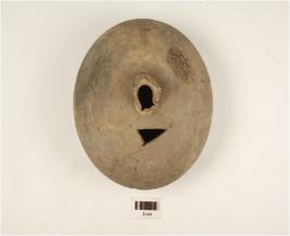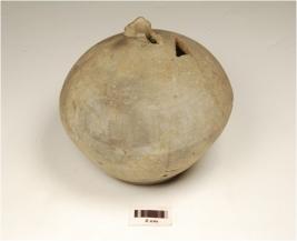 | Description / विवरण | A pouch on dark grey ware, rim is partly broken, globular body and flat base, a triangular shape made on the shoulder. |