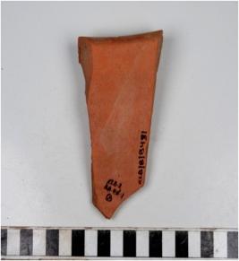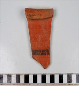 | Description / विवरण | A fragment of a basin of red ware with flanged rim, having black horizontal rim band on rim edge, straight sides, painted with black showing horizontal band on exterior, treated with red slip of fine fabric. |