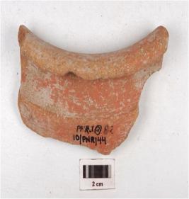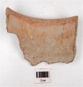 | Description / विवरण | A fragment of a pot sherd of red ware with two horizontally groove lines on the exterior surface of medium fabric, showing an oxidized core and treated with red slip. |