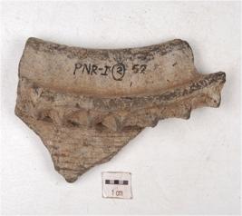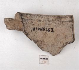 | Description / विवरण | A fragment of a pot sherd of red ware with two horizontally groove lines on the exterior surface of medium fabric, showing an oxidized core and treated with red slip. |