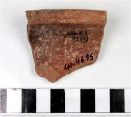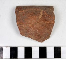 | Description / विवरण | A fragment of a bowl of red ware with incurved vertical rim, tapering sides, treated with chocolate slip of medium fabric. |