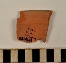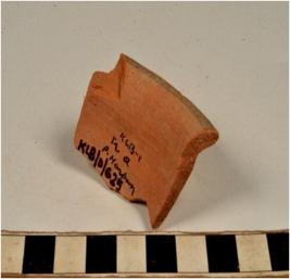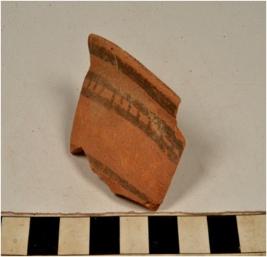 | Description / विवरण | A fragment of a miniature pot of red ware with slightly out turned rim, straight sides painted with black showing horizontal rim band and below vertical strokes inbetween horizontal band on exterior of medium fabric. |