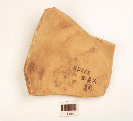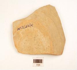 | Description / विवरण | Base fragment of a bowl of red ware with flat base and spreading profile. |
