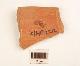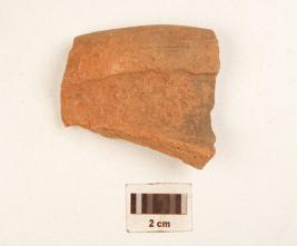 | Description / विवरण | Fragment of a vase of red ware, treated with red slip on both sides has externally thickened rim and concave neck. |