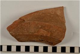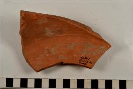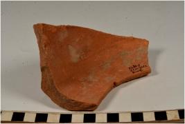 | Description / विवरण | A fragment of a lower portion of a pot of red ware with flat base carination on waist of medium fabric. |