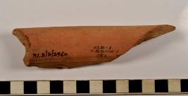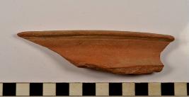 | Description / विवरण | A fragment of a vase of red ware with out turned rim, concave neck, showing black horizontal band on rim edge of fine fabric. |