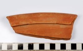 | Description / विवरण | A fragment of a dish of red ware with internally thickened rim, flat base of thick fabric well levigated. |
