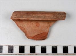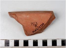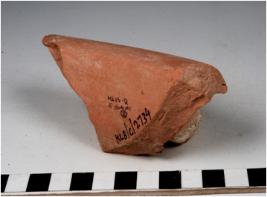 | Description / विवरण | A fragment of a storage jar of slipped red ware with flanged rim, concave neck showing black horizontal band on rim edge of thick fabric. |