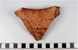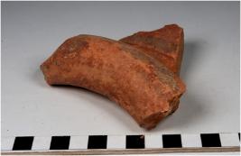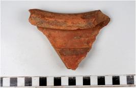 | Description / विवरण | A fragment of a jar of slipped red ware with flanged rim, concave neck and tapering sides of thick fabric well levigated. |