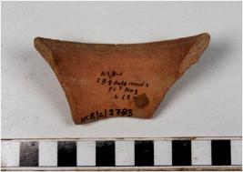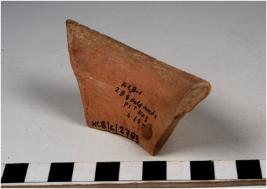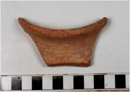 | Description / विवरण | A fragment of a vase of red ware with flaring rim, concave neck , oblique sides of medium fabric, |