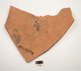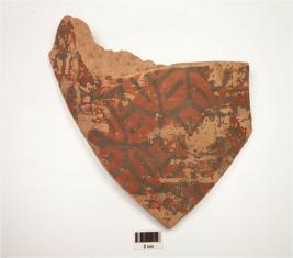 | Description / विवरण | Fragment of black on red ware vessel, treated with red slip and decorated with leaf motif, medium fabric and well baked |