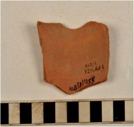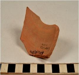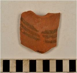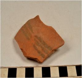 | Description / विवरण | A potsherd of a red ware painted with black showing horizontal bands on exterior of fine fabric. |