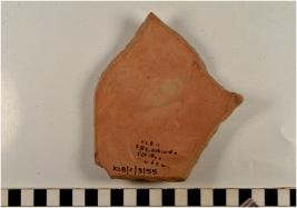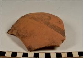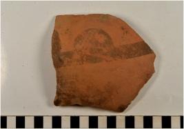 | Description / विवरण | A mid potsherd of red ware painted with black showing a thick horizontal band and semi circles feiled with criss cross pattern on exterior of medium fabric. |