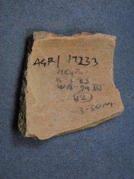 | Description / विवरण | It is a broken fragment of a pot made of terracotta was found in Agroha trench no.WA29, layer no.12. It is well fired and color is red. It has some cut marks and flaking on its surfaces. It is a wheel made pottery. |