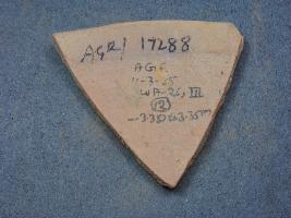 | Description / विवरण | It is a broken fragment of a pot made of terracotta was found in Agroha trench no.WA29, layer no.6. It is well fired and color is red. It has some cut marks and flaking on its surfaces. It is a wheel made pottery.Its outer side carved by incised line design. |