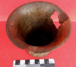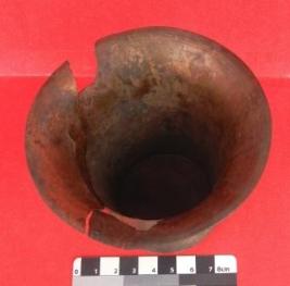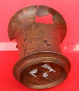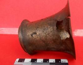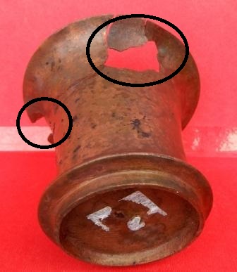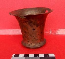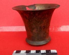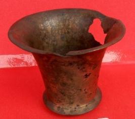 A tumbler made of brass which have a base and out turned widened mouth, some cracks are visible on its outer surface.