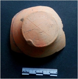 | Description / विवरण | It is a red ware potsherd with graffiti mark on It is well fired and is red in color. It has flat circular base on which a cross Graffiti mark can be seen. |