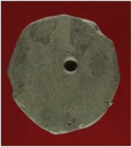 | Description / विवरण | Trench YA 1, Qdt 4, layer 2, depth 90-110 cms It s a cake made of clay. Shape is circular and surface is smooth with greyish appearance. There is a pit at one side and margin is damaged. |