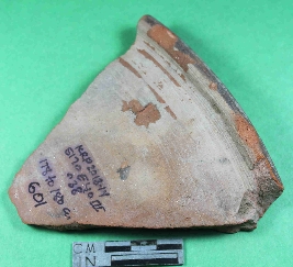 | Description / विवरण | Fragment piece of a basin of red ware, flaring rim, tappring profile. It has circular black colour band on exterior surface. |