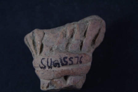 Handle of lamp has incised motifs on it and a band can be seen on the surface.