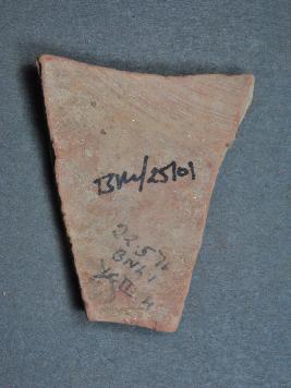 | Description / विवरण | It is a broken rim fragment of a pot made of terracotta was found in Banawali trench no. YC4, layer no.3. It is well fired and color is red. It has some cut marks and flaking on its surface. It is wheel made pottery. |