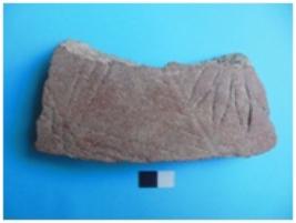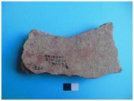 | Description / विवरण | Fragment of a vessel of red ware with some indeterminate floral and geometric designs. It is treated with a dark red slip which has peeled off from most of the area. |