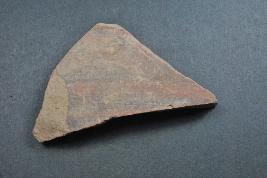 | Description / विवरण | It is a broken fragment of a pot made of terracotta was found in Banawali trench no. ZB4, layer no.10. It is well fired and color is red. It has some cut marks and flaking on its surface. It is wheel made pottery. Its outer side carved by black slip design. |