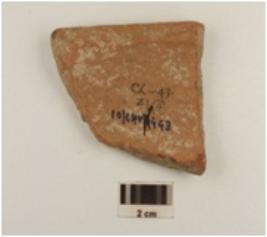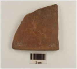 | Description / विवरण | A fragment of bowl of red ware, slightly in curved rim medium fabric, showing an oxidized core and treated with red slip. |