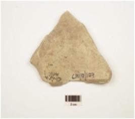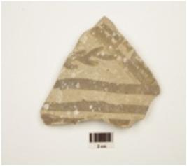 | Description / विवरण | Fragment of potsherd a bowl of buff ware,painted with horizontal bands, oblique band, cross hatched motif and leaf pattern in chocolate pigment on the exterior,has a vertical thickened rim and straight profile. |