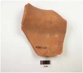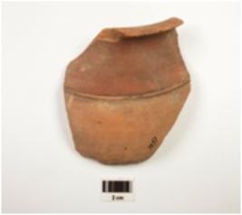 | Description / विवरण | Fragment of a black on red ware handi with broken out-curved rim,red slip on upper body, ridge on exterior with horizontal lines painted in black pigment, medium fabric and well baked. |