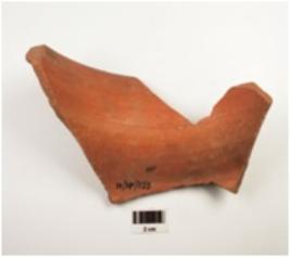 | Description / विवरण | Fragment of a black on red ware vase, broken our-curved thickened rim, horizontal bands and triangle shaped design with check pattern inside painted in black pigment, red slip, medium fabric and well baked. |