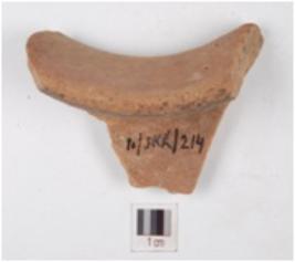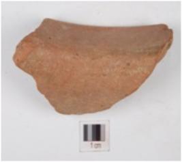 | Description / विवरण | Fragment of jar of red ware, treated with red slip on the exterior and painted with rim band in black pigment, obliquelly splayed out rim and spreading shoulder. |