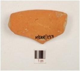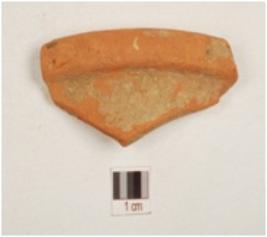 | Description / विवरण | A fragment of vase of red ware with horizontal out curved rim, concave neck, medium fabric and treated with red slip. |
