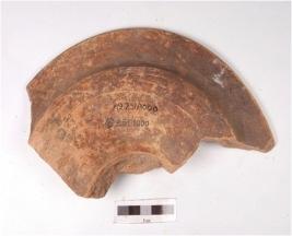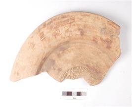 | Description / विवरण | A fragment of red ware dish or dish on stand hearing with incised nail design in three circles on well baked and treated with red slip on both sides. |