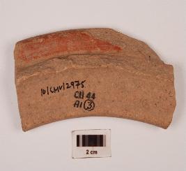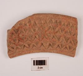 | Description / विवरण | A fragment of wide mouthed jar of dull red ware with grooved zig-zag design on top and medium fabric. |