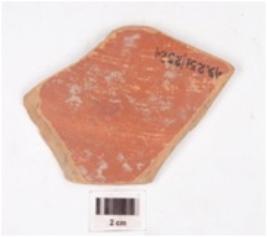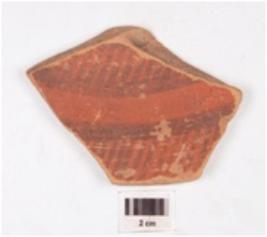 | Description / विवरण | A fragment of dish of red ware, treated with red slip on the both surface painted with horizontal lines and filled up with hatching. |