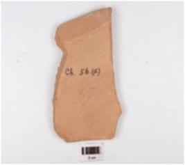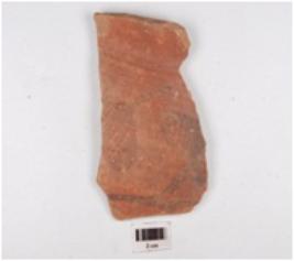 | Description / विवरण | Fragment of a base of black-on-red ware, with broken rim, concavity below, receeding profile decorated with hatched peepal leaf motifs in black pigment. |