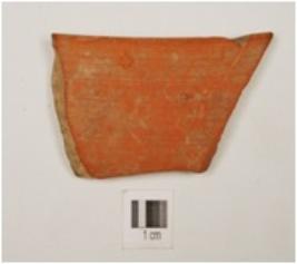 | Description / विवरण | A fragment of dish of red ware, has vertical internally thickened rim and carinated profile. |