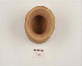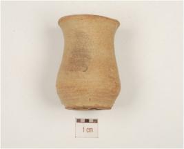 | Description / विवरण | A dull red ware miniature vase with outcurved rim, convex body and flat base. |