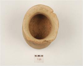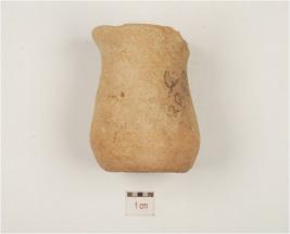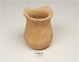 | Description / विवरण | A dull red ware miniature vase with partly broken outcurved rim, convex body and flat base. |