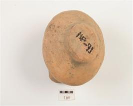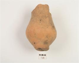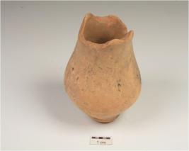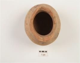 | Description / विवरण | A miniature vase of red ware, treated with red slip on the damaged flaring rim, bulging profile and foot base. |