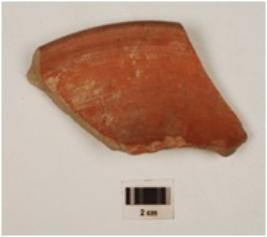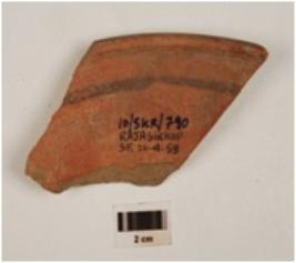 | Description / विवरण | Fragment of red ware vase, painted with slanting lines on rim and horizontal band on interior part in black pigment, horizontally nail headed rim treated with red slip on surface, medium fabric and well baked. |
