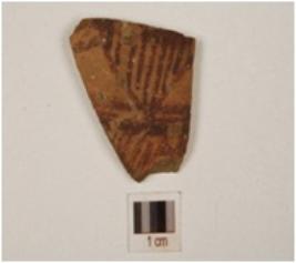 | Description / विवरण | Fragment of dull red ware painted with triangular hatched, horizontal lines in dark red pigment on surface, medium fabric and well baked. |